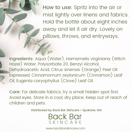Skin benefits: Crafted without alcohol, this mist is soft enough for fabrics that touch your skin. The essential oils support a sense of balance while keeping your environment feeling fresh and clean.
